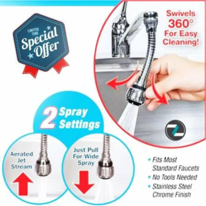- Turbo Flex 360 quickly upgrades your ordinary faucet into a flexible sprayer with extended reach. The dual function Stream & Spray makes for easier cleaning of odd size objects, and rinsing out the sink. Great for rinsing fruits and veggies, filling tall vases, shampooing hair and more. Provides 360 degree range of motion and attached easily without tools to fit most standard sized faucets. Making cleaning the sink and odd size items easy. Attaches easily without tools to fit most standard-sized faucets. Perfect for kitchens, bathrooms and laundry rooms. The 6 inch hose is made of durable smart and is flexible, so it can reach where ordinary faucets can Attach easily without tools. Cuts cleaning time in half. Color : Silver Package Includes:1Pc Turbo Flex Extension Faucet. Product dimensions: 6″ x 1.5″x 1.5″ CM