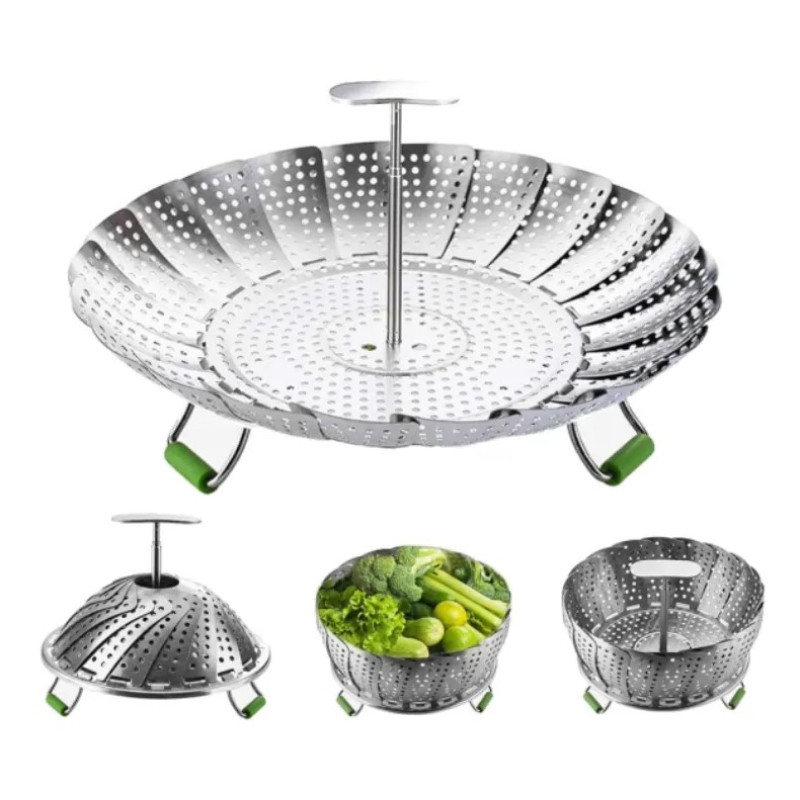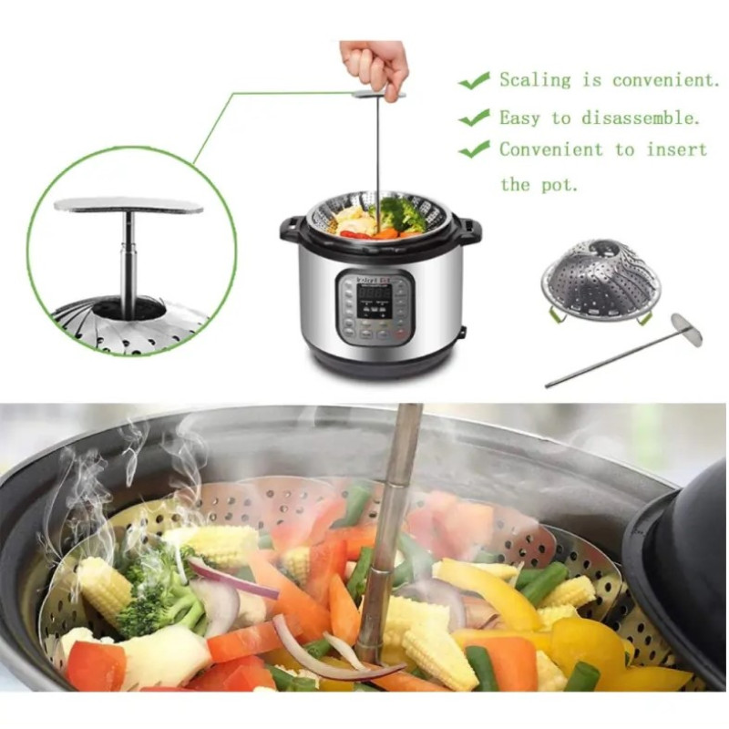 EXPANDABLE AND COLLAPSIBLE DESIGN: You can easily open and close the steamer.Vegetable steamer basket collapsed diameter is 5.5 inches. It expands to 9 inches once petals are stretched out.The adjustable steamer fits well in pressure cooker, pots pans with 3, 5, 6, 8 quarts capacity. The metal steamer basket blades can be folded compactly so you can save storage space than large mesh steamer basket.