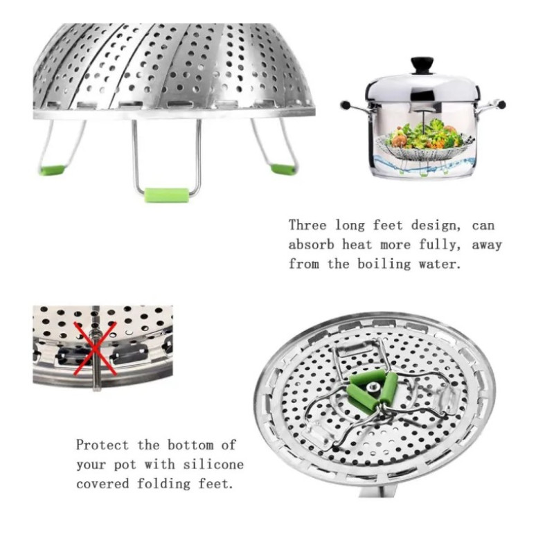 FOLDABLE LEGS WITH SILICONE:Three feet covered with silicone protect the bottom of the pot from being scratched.The 3 legs with 1.2″ long stand more stably elevating the steamer insert, keep food above boiling water that absorbs water vapor more fully.The three feet covered with silicone can protect the bottom of the pan from being scratched and prevent the food from slipping. When you are done using it, you can fold it up without taking up space.
