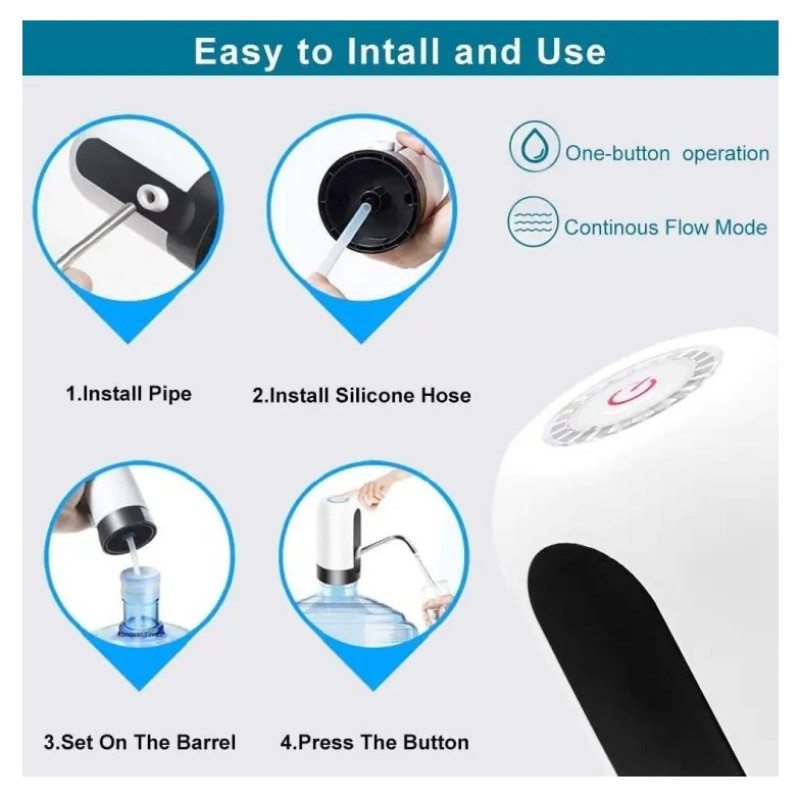 - AUTOMATIC WATER DISPENSER PUMP – Comes with a C type charging cable and it is activated by simply pressing the button on the top. Fits bottle with the capacity 20 liters