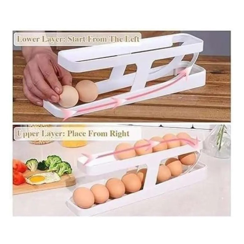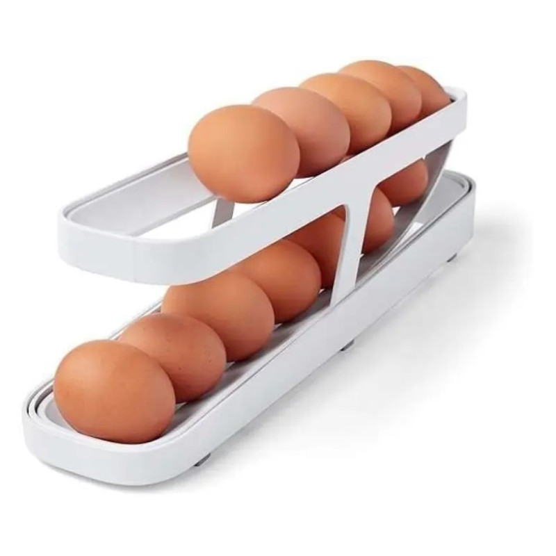 • keeps eggs in order, roll egg holder is designed with 2 tiers that can hold 12-14 standard, large or jumbo eggs in your fridge, with small footprint saves space in the fridge. Two-tier organizer with small footprint saves space in the fridge and lets you throw away the cardboard.