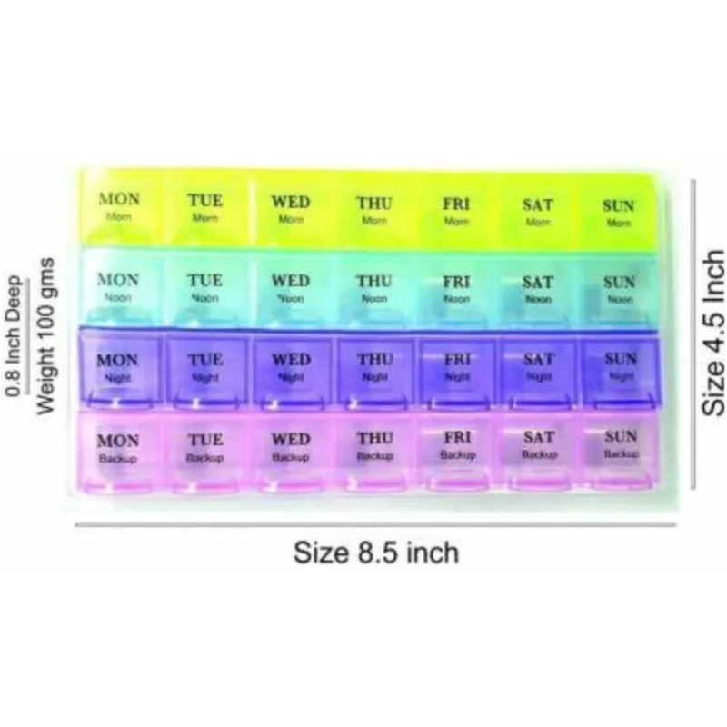 - Medicine Box Organizer by celebration gift – Never forget your pills again This beautiful pill organizer features shiny pastel colour shades, and includes 28 compartments with gentle reminders of when to take what pill for everyday of the week. It helps you keep track of all the medicines you need to take either 4 times a day or 4 weeks of the month. Not just pills, but keep all your jewellery, rubber bands, clips as well as the smallest of items like memory cards in this box. It is easy to see through because of it’s transparent body and the inside content can be spotted without having to open each compartment. Reminders printed on each compartment Not just a place to find all your pills together, this box organizer by celebration gift comes with helpful prints on each compartment. Don’t wreck your brain trying to recall when to take which medicine. With this box, you can store all your daily scheduled pills or vitamins according to the time of the day you have to take them. The names of the days of the week and time slots( Morn-noon-night) are mentioned on each compartment with an extra backup compartment in case there is more.