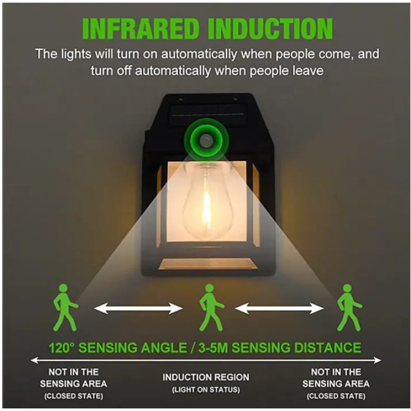 • The solar wall light has a built-in intelligent motion sensor that sensitively detects motion within a 120° angle within 8 meters. Press the on/off to switch 3 different modes: 1.When motion is detected, the wall light will turn on to 100%, and will be off after the movement leavs for 15s. 2. When motion is detected, it will turn on to 100%, the solar wall light will change to 50% brightness after the movement leaves for 15s. 3. Always keep 50% low brightness mode all night.