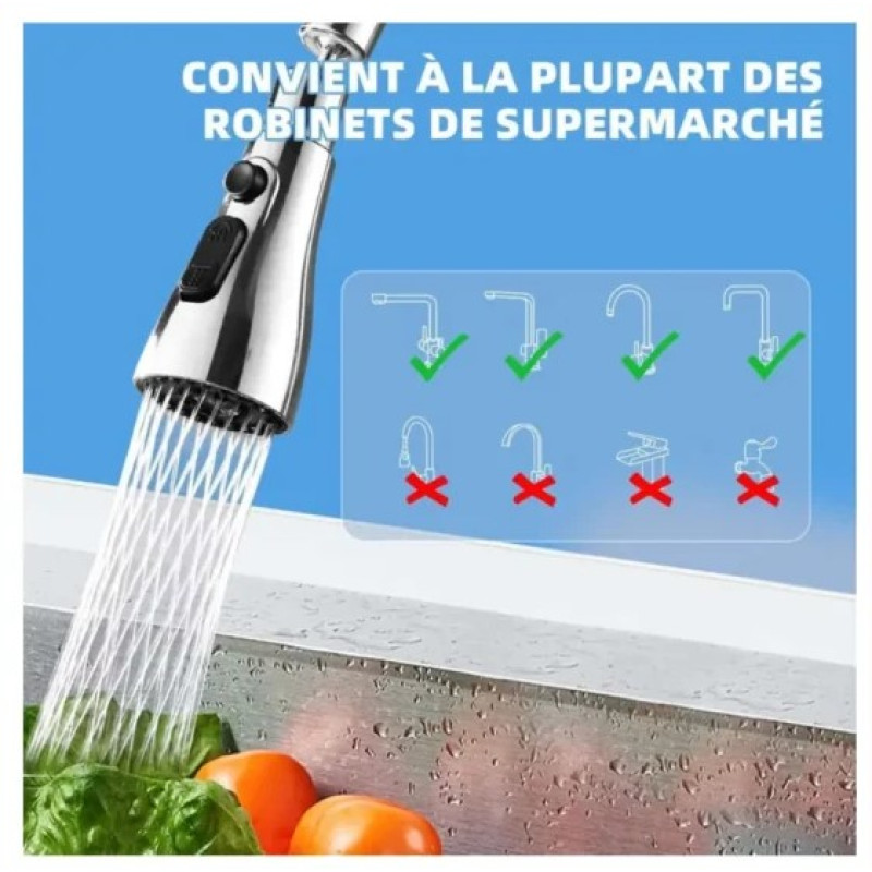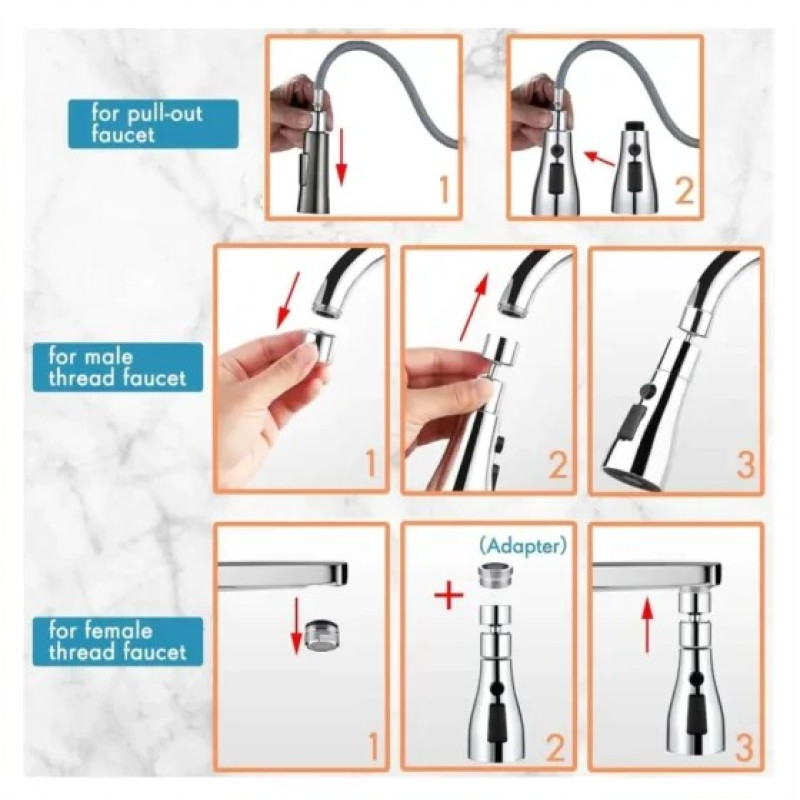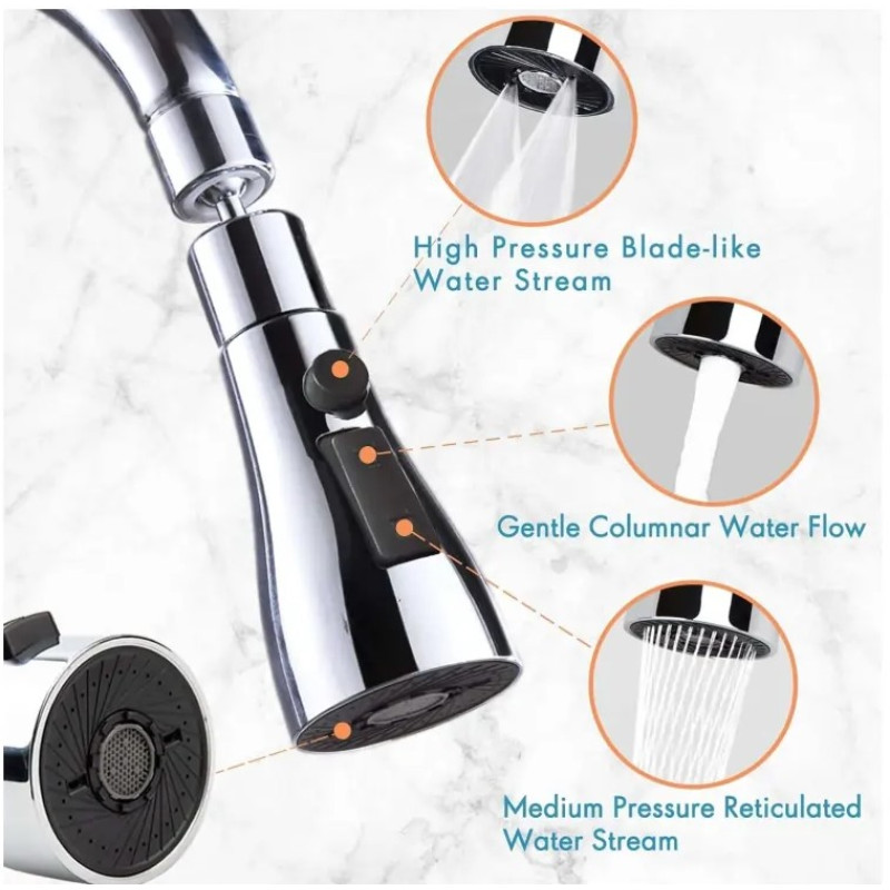 - Kitchen faucet extender provides 3 functions; gentle water flow for daily use; medium pressure water flow for cleaning sinks; high pressure water flow is suitable for washing dishes, or rinsing stains.